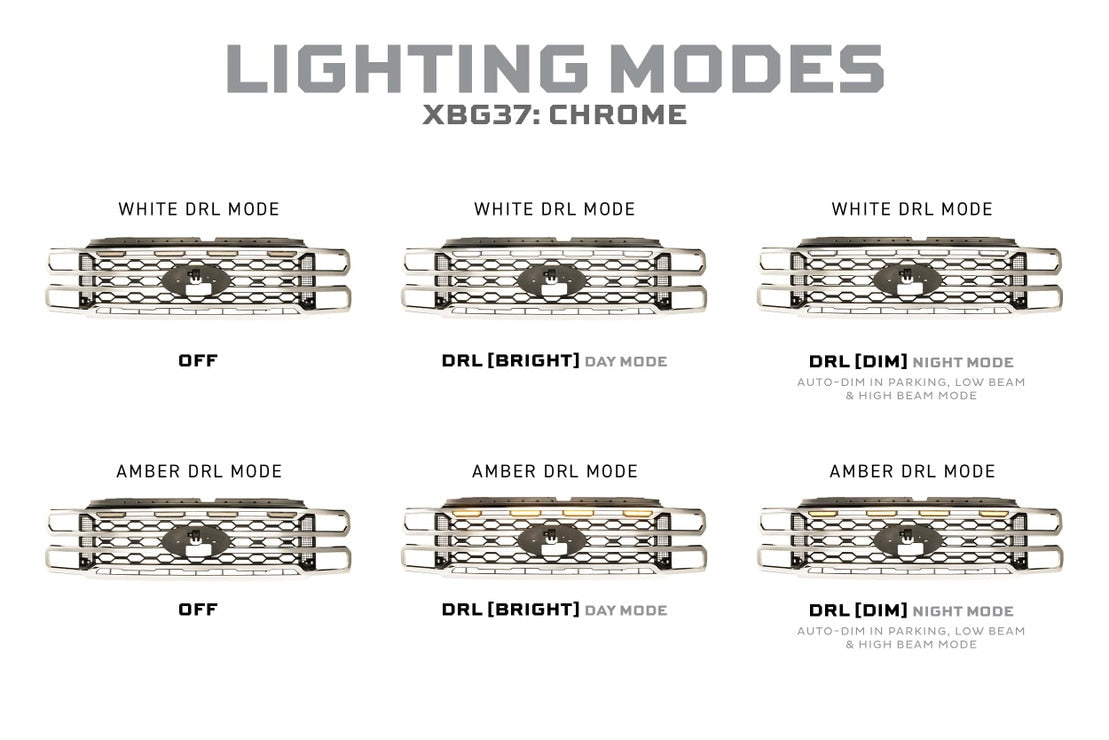 Introducing the Morimoto XBG Grille for 2023+ Ford Super Duty trucks. With integrated LED Daytime Running Lights (DRL), they offer both an incredibly bright daytime mode and a dimmed parking light mode for glare-free output. The four marker lights can be easily configured to run either white or amber. These grilles are available in chrome or painted gloss black and are highly customizable, allowing you to paint or wrap the front trim pieces to match your truck's aesthetic. The grille is compatible with the full range of 2023+ Super Duty trucks and installs easily with stock mounting points and hardware. With the included adapter harness, the XBG grille is a plug and play design to either stock or aftermarket headlights. Elevate your truck's appearance and lighting performance effortlessly with the Morimoto XBG Grille -- the ultimate upgrade for discerning truck enthusiasts.